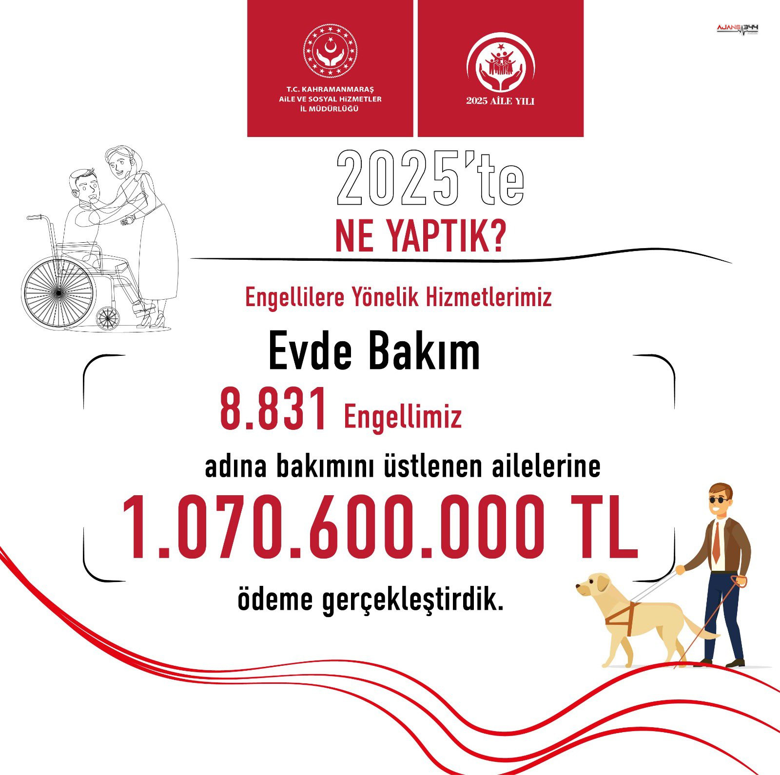 2025 Aile Yılı kapsamında, Kahramanmaraş Aile ve Sosyal Hizmetler İl Müdürlüğü engelli bireylerin yaşamlarını kolaylaştırdı. Engellilere yönelik sunduğu Evde Bakım Hizmet Modeli ile 8.831 engelliye hizmet sağlanırken, bakımını üstlenen ailelere toplamda 1.070.600.000 TL destek verildi.