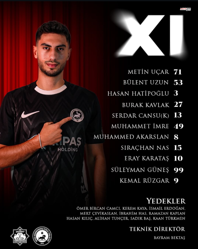 Kahramanmaraş İstiklalspor’un Aksaray deplasmanında sahaya çıkacağı ilk 11 şu isimlerden oluştu: Metin Uçar, Bülent Uzun, Hasan Hatipoğlu, Burak Kavlak, Serdar Cansu, Muhammet İmre, Muhammed Akarslan, Sıraçhan Nas, Eray Karataş, Süleyman Güneş ve Kemal Rüzgar.