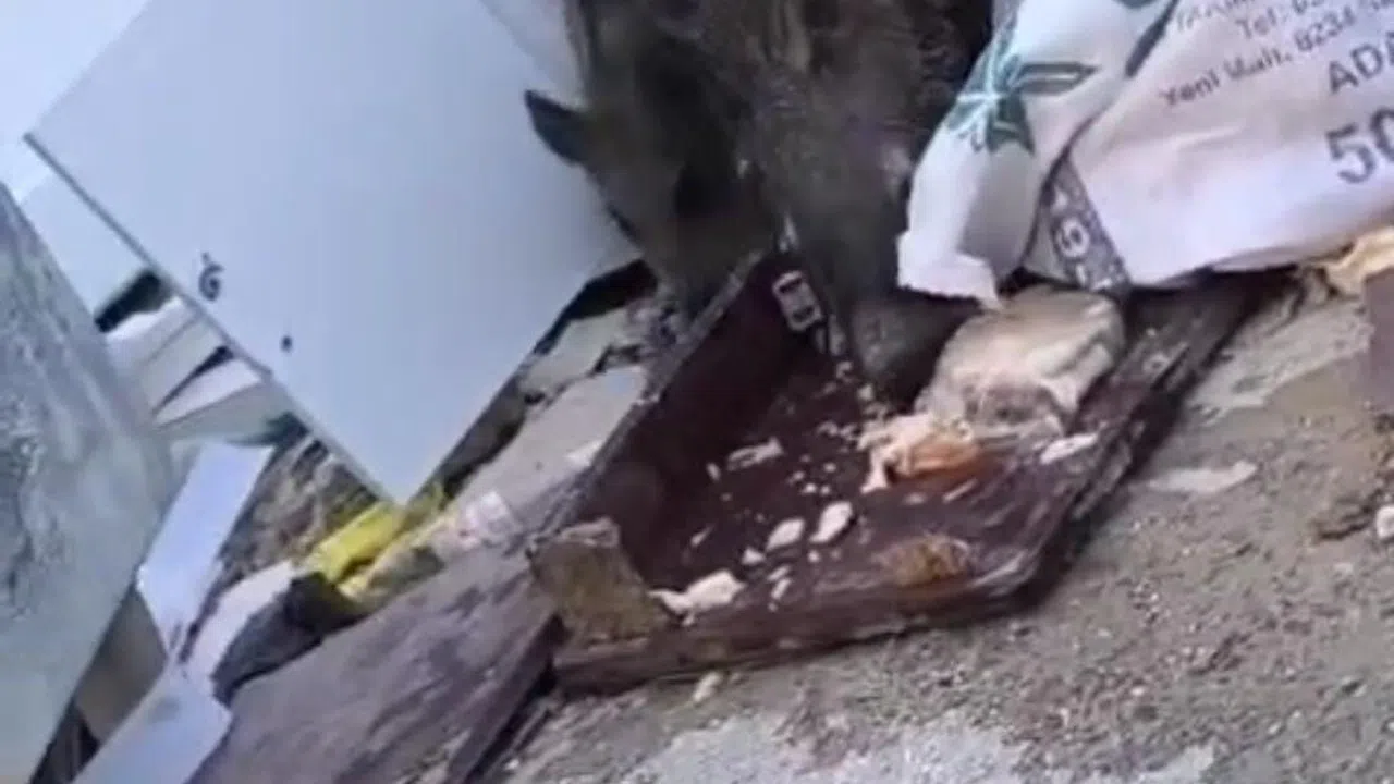 Kahramanmaraş merkezli depremlerden etkilenen Hatay'da yiyecek aramak için şehre inen domuz ve yavruları cep telefonu kamerasına yansıdı.