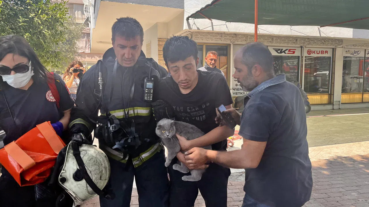 Mahalle sakinlerinin 112 Acil Çağrı Merkezi'ne ihbarı üzerine olay yerine itfaiye, polis ve sağlık ekipleri sevk edildi. Yoğun dumanla kaplanan apartmana yangın merdiveniyle ulaşan itfaiye ekipleri, balkonda mahsur kalan Kaya ve kedisini güvenli şekilde tahliye etti. Vücudu dumandan etkilenen genç, sağlık ekiplerince yapılan ilk müdahalenin ardından hastaneye kaldırıldı. Kurtarılan kedinin de yangın sırasında büyük korku yaşadığı görüldü.