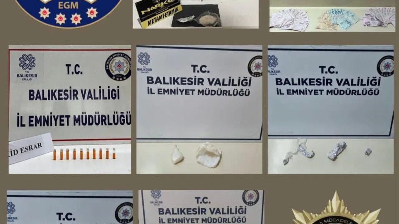 Balıkesir İl Emniyet Müdürlüğü Narkotik Suçlarla Mücadele Şube Müdürlüğü 08-11 Temmuz tarihlerinde il genelinde 34 operasyon gerçekleştirdi. Yapılan operasyonda; 108,51 gram metamfetamin maddesi, 111,92 gram sentetik kannabinoid (bonzai) maddesi, 67 adet ecstasy hap, 20,12 gram esrar maddesi, 39,57 gram likid esrar maddesi, 6,39 gram kokain maddesi, 141 adet sentetik ecza hap, 3 adet uyuşturucu madde içiminde kullanılan cam aparat (payp), 2 adet hassas terazi, bir tabanca, 4 adet tabanca fişeği ve suçtan elde edilen 30 bin 650 TL para ele geçirildi. Yapılan operasyonlarda 46 şüpheli şahsa işlem yapılırken, adli makamlara sevk edilen 4 şüpheli şahıs tutuklandı.