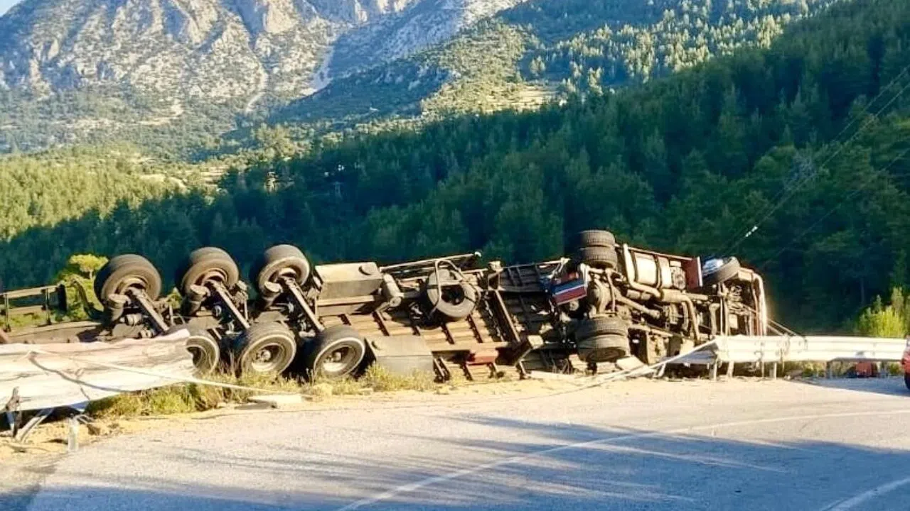 Antalya'da kontrolden çıkan demir profil yüklü tırın devrilmesi sonucu meydana gelen trafik kazasında tırın çekicisinin altında kalan 25 yaşındaki sürücü hayatı...