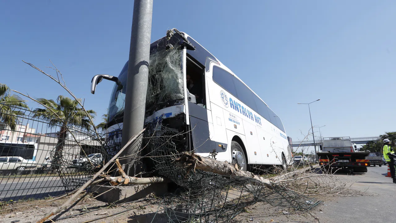 Antalya'da direksiyonu kilitlenen ve yaklaşık 50 metre ağaçları yıkarak refüjde ilerleyen otobüs yol tabelasına çarparak durabildi. Kazada direksiyon başında sıkışan ve itfaiye ekip bulunduğu yerden çıkartılan sürücü yaralandı.