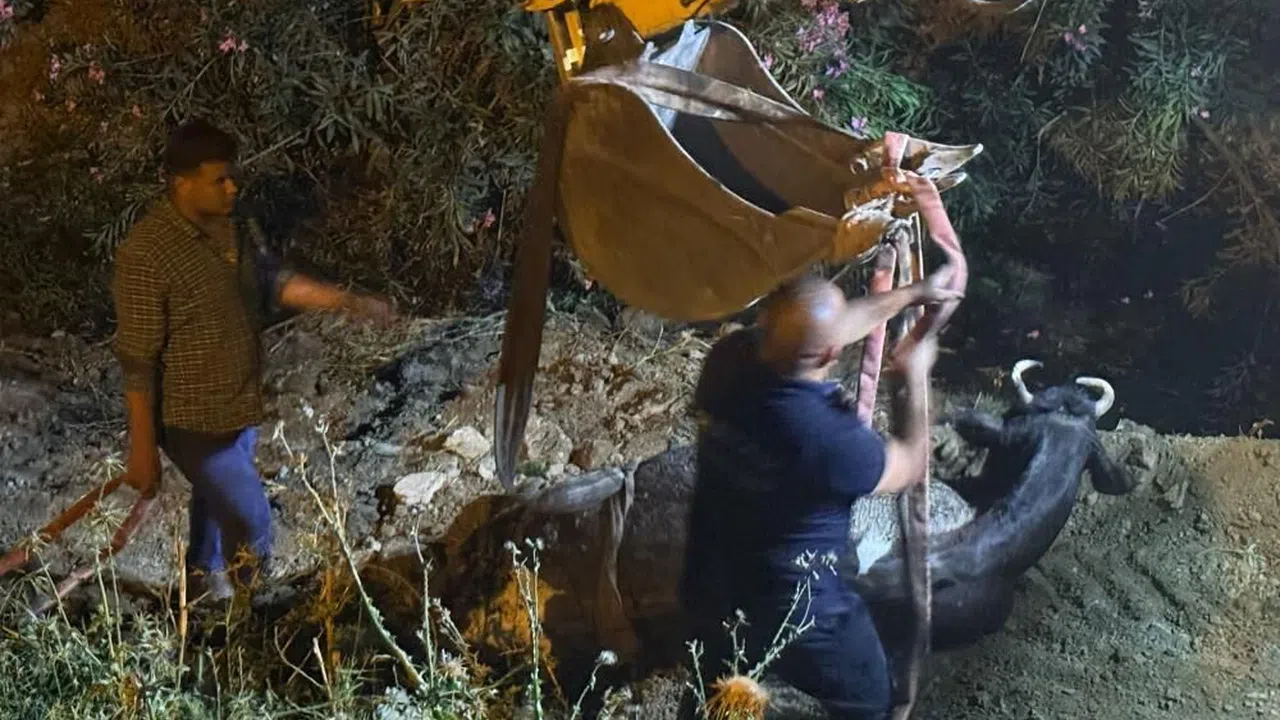 Kırıkhan ilçesi Fatih Mahallesi'nde su kanalına düşen inek, çamura saplandı. İneği kendi imkanlarıyla kurtaramayan vatandaş durumu itfaiye ekiplerine bildirdi. Bölgeye intikal eden Hatay Büyükşehir Belediyesi itfaiye ekipleri, ineği kurtarmak için kepçe destekli operasyon başlattı. Çamura saplanan inek, ekiplerin çalışmalarıyla temizlenen su kanalından kepçeye bağlanarak kurtarıldı. Sağlık durumu iyi olan inek sahibine teslim edildi.