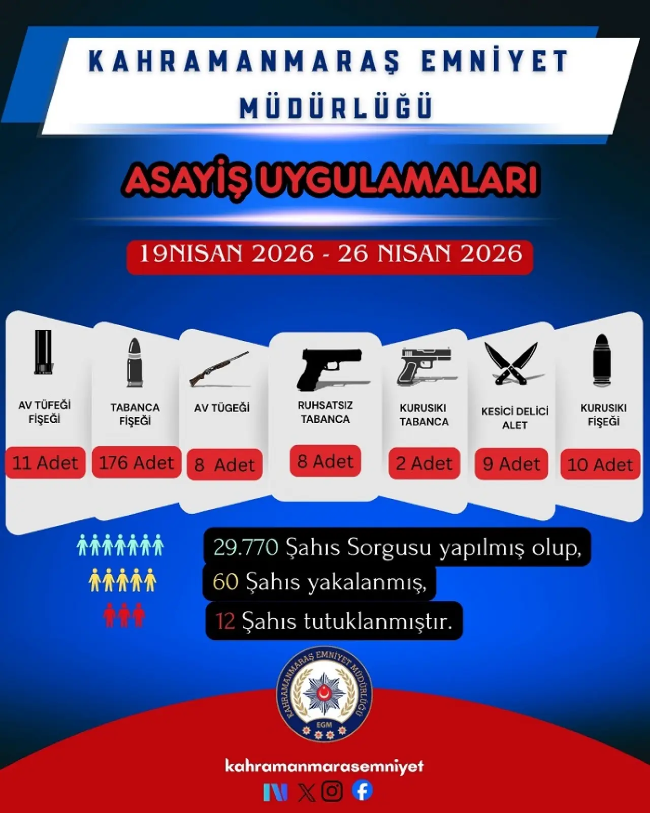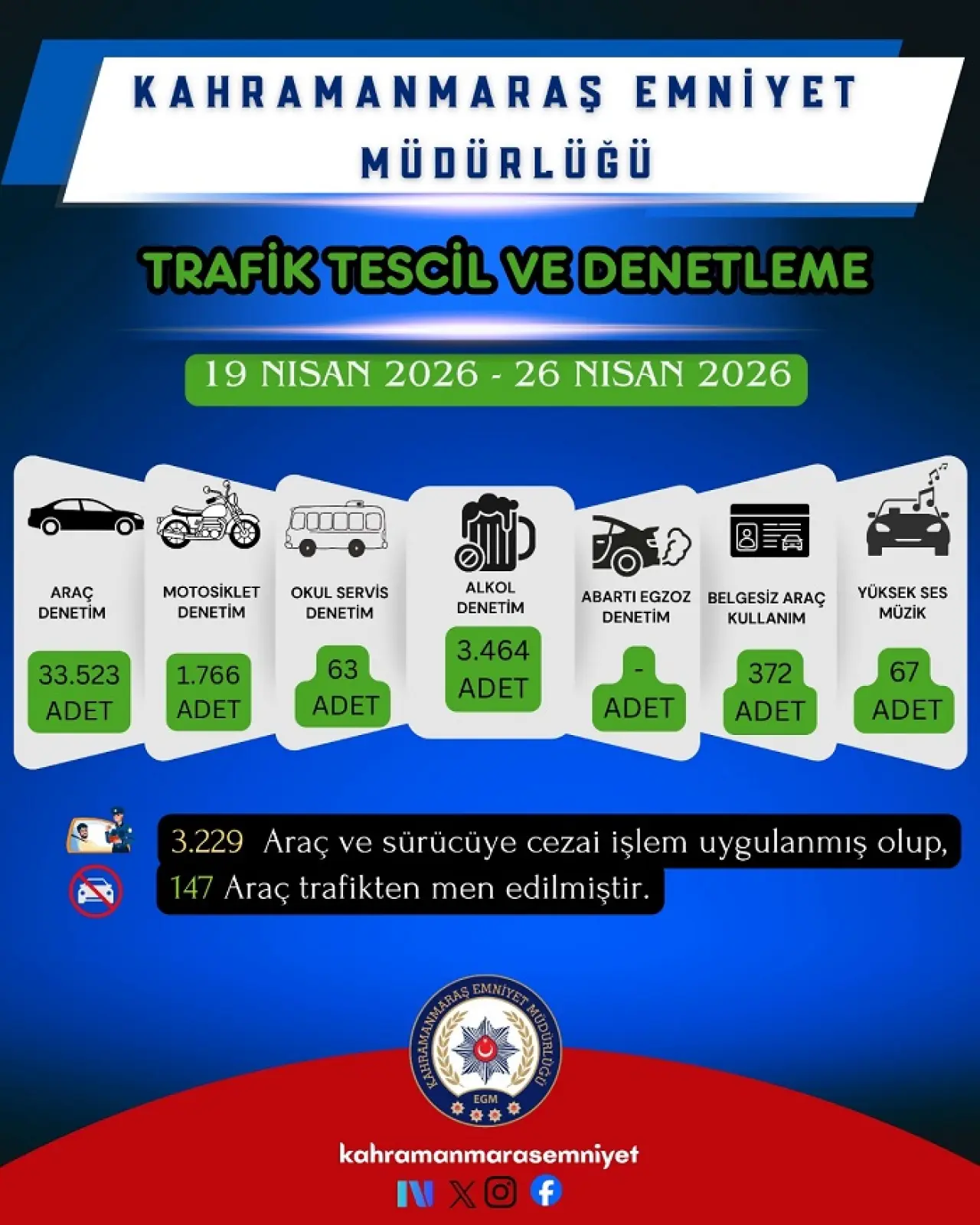 Kahramanmaraş İl Emniyet Müdürlüğü, 19-26 Nisan 2026 tarihleri arasını kapsayan haftalık asayiş, trafik ve narkotik uygulama sonuçlarını kamuoyuyla paylaştı. Şehir genelinde yürütülen çalışmalarda huzur ve güven ortamının devamlılığı için on binlerce şahıs ve araç denetimden geçirildi.