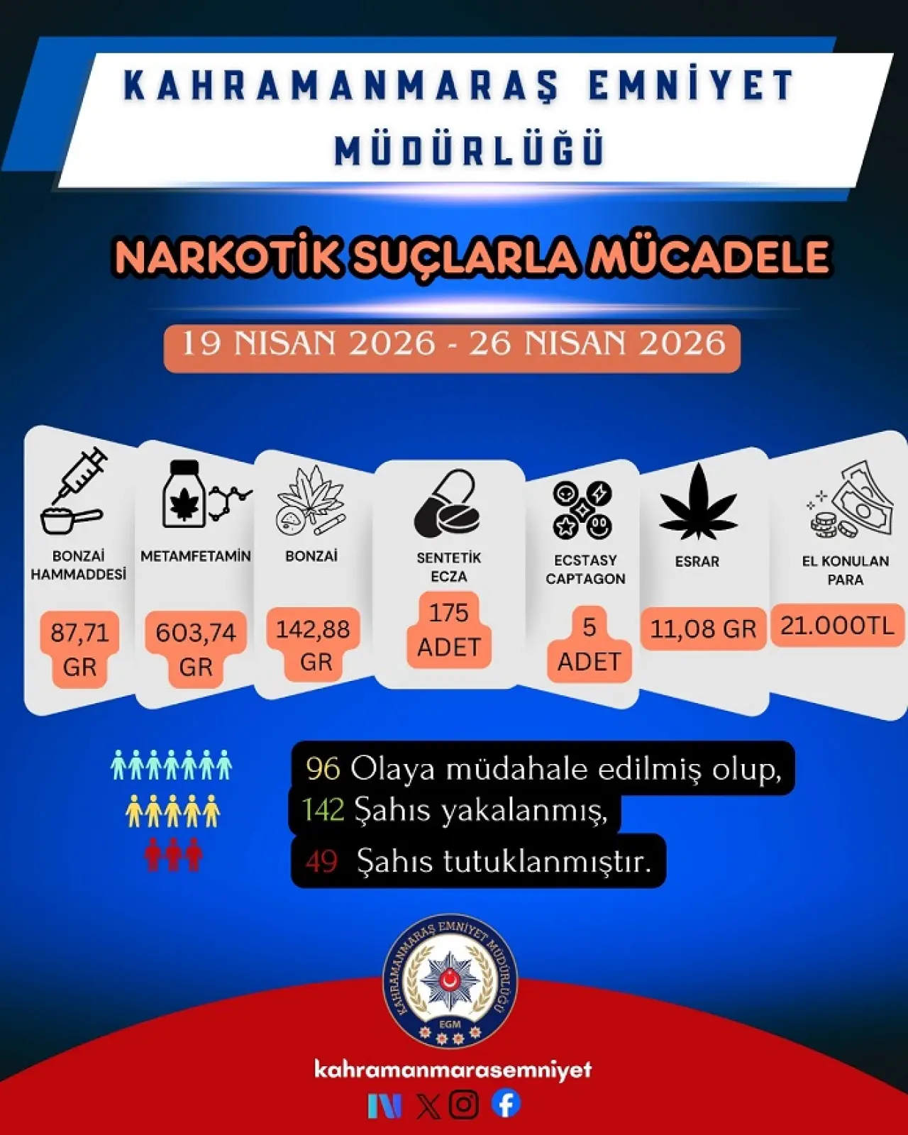 Uyuşturucu madde kullanımını ve ticaretini önlemeye yönelik faaliyetlerde, narkotik ekipleri bir hafta içinde 96 olaya müdahale etti. Yakalanan 142 şüpheliden 49’u tutuklanarak cezaevine gönderildi. Uygulamalarda metamfetamin, bonzai ve çeşitli sentetik ecza maddeleri ele geçirilirken, suçtan elde edildiği değerlendirilen 21 bin TL nakit paraya el konuldu.