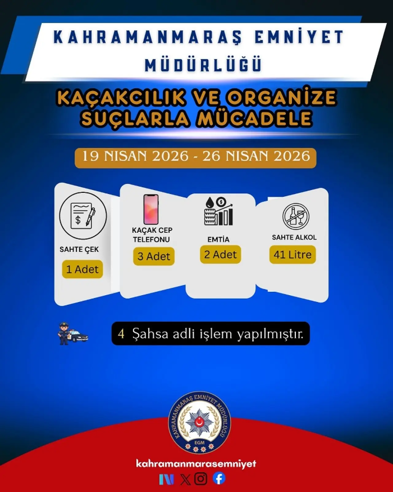 Kaçakçılıkla mücadele kapsamında yapılan çalışmalarda sahte alkol, kaçak cep telefonları ve sahte çek gibi suç unsurları ele geçirildi. Toplamda 4 şahıs hakkında adli işlemin başlatıldığı hafta genelinde, emniyet birimlerinin şehrin huzuru için 7/24 esasına göre sahada olduğu vurgulandı.