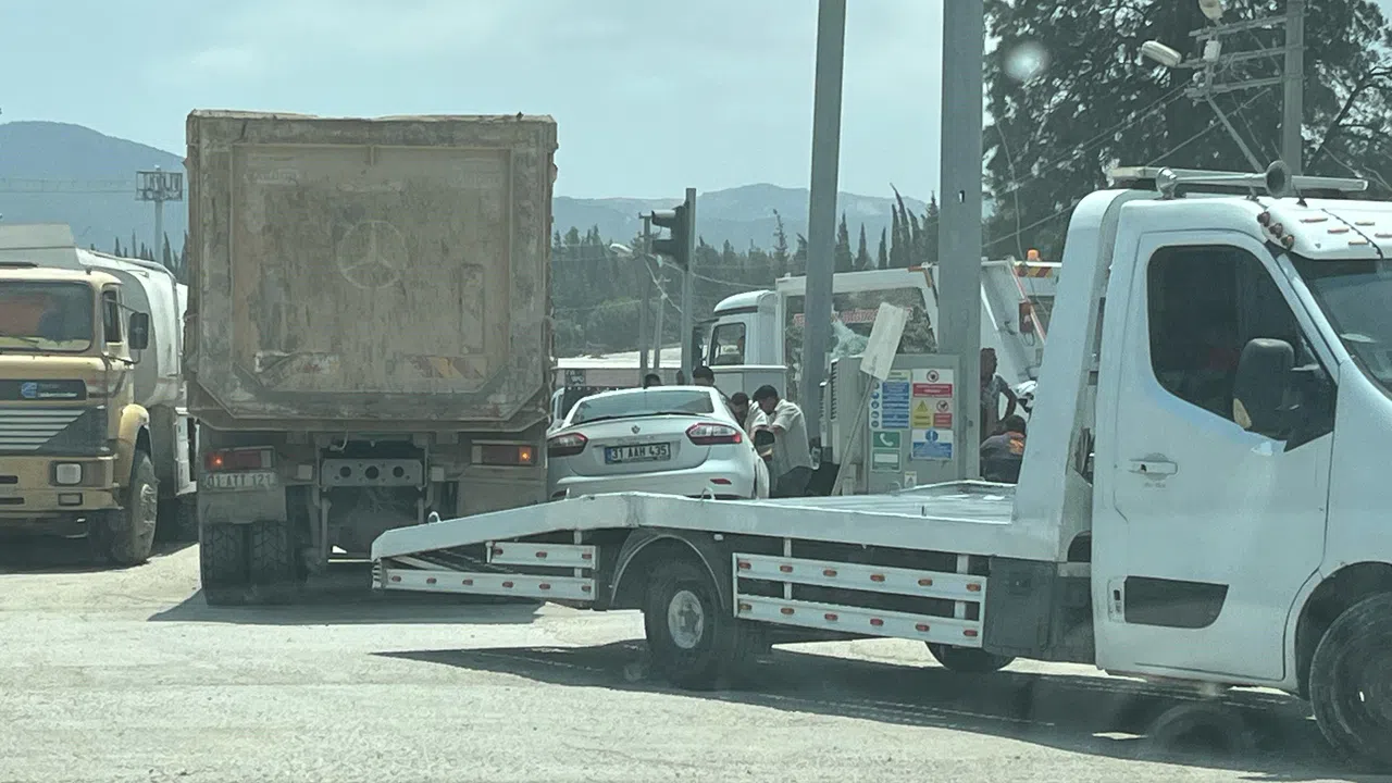 Kaza, Antakya ilçesi Akasya Mahallesi 75. Yıl Bulvarı'nda yaşandı. Trafik ışıklarının yeşile dönmesiyle birlikte hareket eden 01 ATT 121 plakalı hafriyat kamyonu ile 31 AAH 435 plakalı otomobille çarpıştı. Kazada kamyonun kör noktasına denk gelen otomobil, refüje sürüklendi. Yararlanın olmadığı kaza anbean güvenlik kamerasına yansırken görüntülerde kaldırımda bekleyen vatandaşın anlık refleksle araçların altında kalmaktan son anda kurtulduğu görüldü.