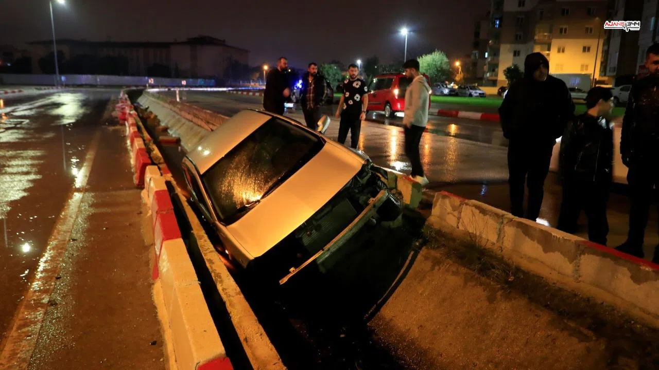 Antalya'da yağmurlu bir gecede meydana gelen trafik kazası, sürücünün soğukkanlılığı sayesinde yaralanmasız sonuçlandı. Kepez ilçesi Habipler Mahallesi'ndeki Elmalılı Hamdi Yazır Caddesi üzerinde, yağış nedeniyle kayganlaşan yolda kontrolden çıkan bir otomobil, refüje çarptıktan sonra yağmur suyu tahliye kanalına uçtu.