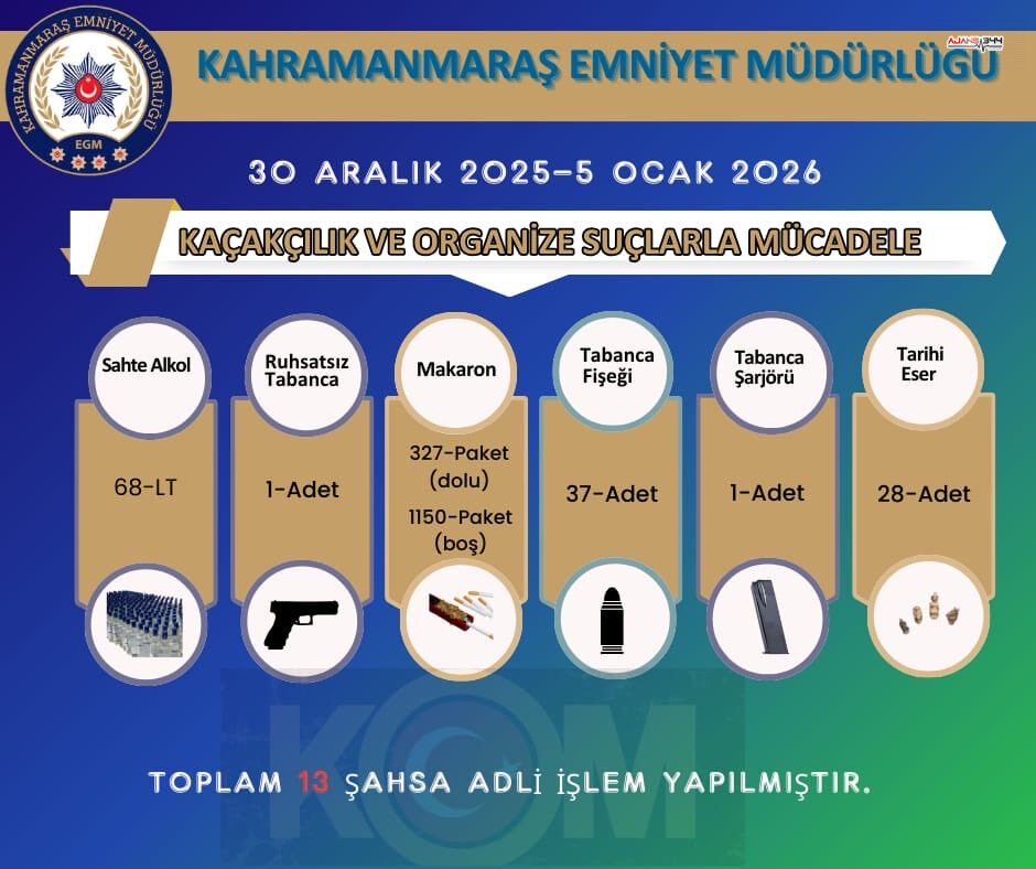 Kahramanmaraş’ta kaçakçılık ve organize suçlarla mücadele kapsamında yürütülen çalışmaların bilançosu açıklandı. Kahramanmaraş Emniyet Müdürlüğü tarafından 30 Aralık 2025 ile 5 Ocak 2026 tarihleri arasında gerçekleştirilen uygulamalarda, çok sayıda yasa dışı envanter ele geçirildi.
