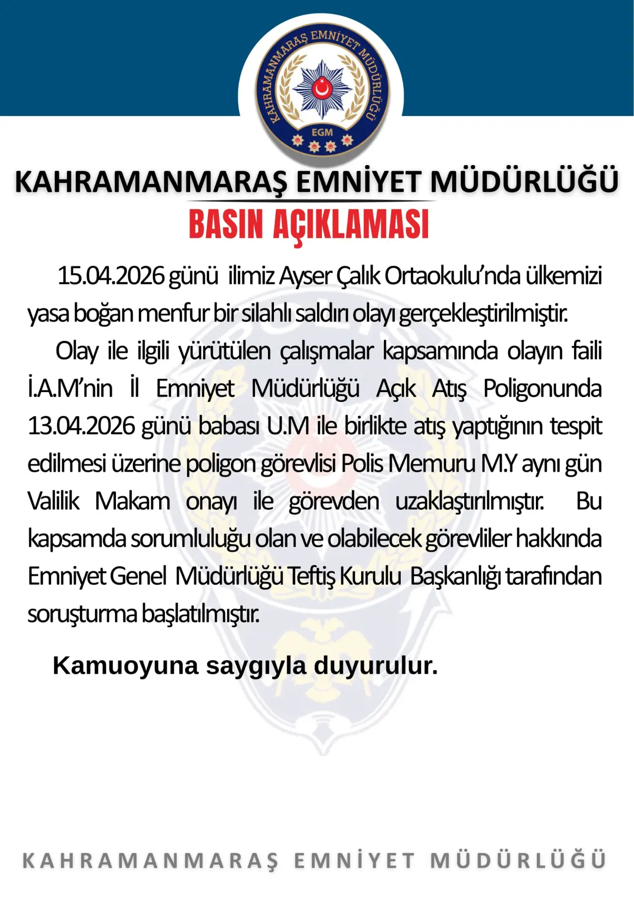 Kahramanmaraş’ta bir ortaokulda meydana gelen olay sonrası İl Emniyet Müdürlüğü tarafından kamuoyuna yönelik resmi bir açıklama yapıldı. Açıklamada, olayın ardından başlatılan inceleme sürecinde dikkat çeken bulgulara ulaşıldığı bildirildi.