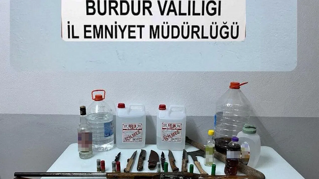 Burdur'un Karamanlı ilçesinde evinde çok sayıda kaçak içki ile çeşitli kesici aletler ve silahlar bulunan şüpheli hakkında adli işlem başlatıldı.