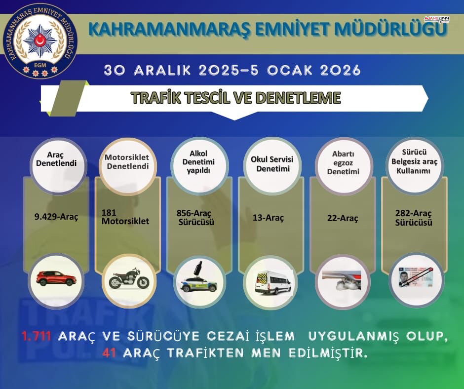 Kahramanmaraş’ta yılbaşı haftasını kapsayan dönemde trafik denetimleri yoğunlaştırıldı. Kahramanmaraş Emniyet Müdürlüğü tarafından 30 Aralık 2025 ile 5 Ocak 2026 tarihleri arasında gerçekleştirilen uygulamalarda, sürücü ve araçlara yönelik kapsamlı kontroller yapıldı.