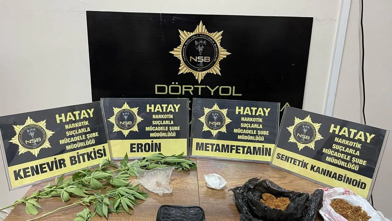Hatay Emniyet Müdürlüğü görevlilerince uyuşturucu imal ve ticaretine yönelik yürütülen çalışmada Dörtyol ilçesinde H.Ç. isimli şahsın Numune Evler Mahallesi’ndeki ikametinde arama gerçekleştirdi. Yapılan aramada 7,13 gram metamfetamin, 2 parça halinde toplam 58,56 gram sentetik kannabinoid, 1,70 gram eroin ve boyları 20 ile 75 santimetre arasında değişen 3 kök kenevir ele geçirildi.
