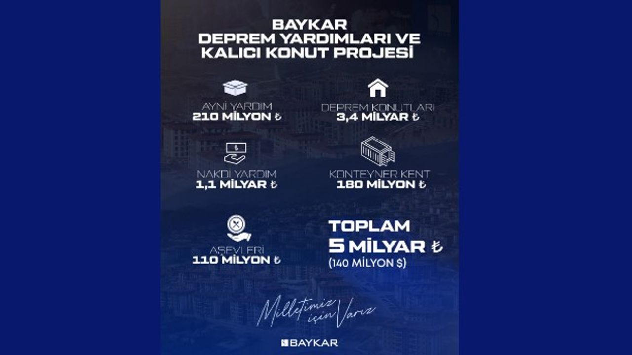Türkiye’nin milli SİHA’larını özgün olarak geliştiren Baykar, 6 Şubat 2023 Kahramanmaraş merkezli depremin ardından başlattığı yardım seferberliği kapsamında depremzede vatandaşlarımız için toplam 5 milyar liralık (140 milyon dolar) yardım ve bağış desteği sağladı.