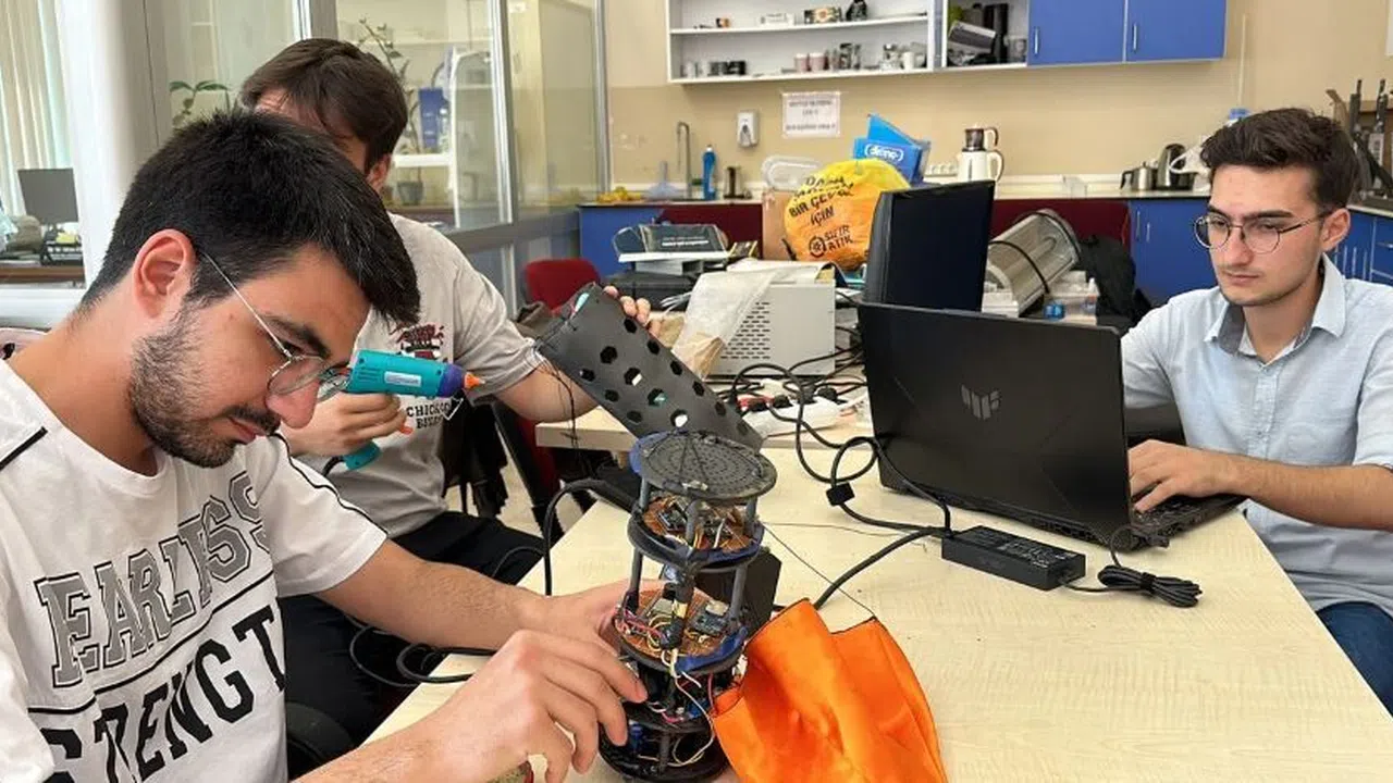 Uydu hakkında bilgi veren Elektrik Elektronik Mühendisliği 3. sınıf öğrencisi Muhammet Mert Büyükbaş, "Geçen sene üniversitemizde uydu takımı vardı. Biz sıfırdan oluşturduk. TEKNOFEST'te bu uydu ile 150 takım arasından 21. olduk. TEKNOFEST'te yarışmak için bu uyduyu yaptık. Bu uydu yarışma öncesinde rokete yüklenir. Roketle beraber 750 metre bir irtifaya çıkar. Bu her sene şartname ile birlikte değişiyor. Roket ile beraber çıktıktan sonra tek kapsül halinde roketten ayrılıyor. 550 metreye kadar tek parça halinde iner. 550 metre irtifadan sonra 2 parçaya ayrılıyor uydumuz bundan sonra 2 parça olarak düşüşe geçer. Düşüş esnasında üzerinde bulunan 10'a yakın sensor ve kameradan yer istasyonu adını verdiğimiz bir bilgisayar programımız var. Buradan kontrol ediyoruz. Bu yazılımı tamamen kendimiz yazıyoruz. Üzerinden aldığı sıcaklık, basınç motor izi gibi verileri ve kamera görüntüsünü hem bu yer istasyonuna data olarak gönderiyor hem de kamera görüntüsünü canlı izliyoruz. Gyro'dan da eksen bilgisini ölçebiliyoruz. Bu yere düşüş esnasında belli metrelerde belli hızda inmesi gerekiyor. Paraşüt hesaplarımız ve uydumuzun aerodinamiği bu şekilde tasarlandı" ifadelerini kullandı.