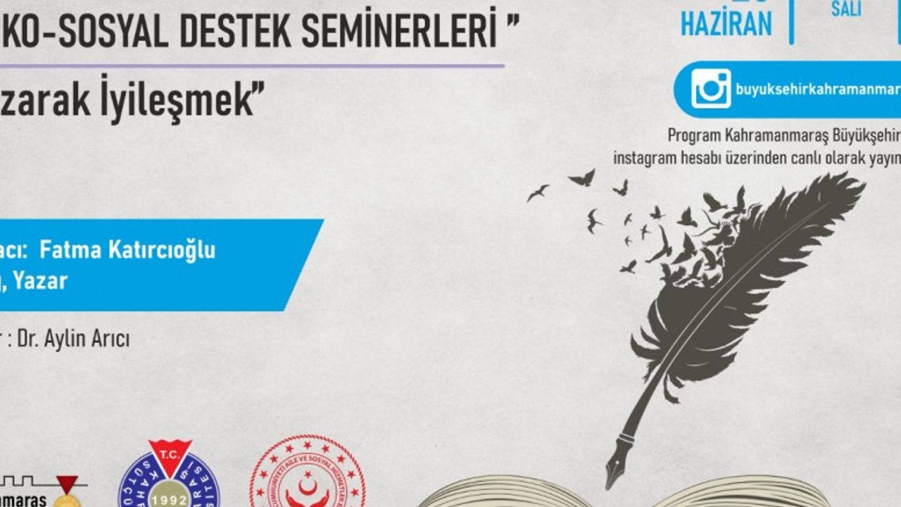Kahramanmaraş Büyükşehir Belediyesi, bir yandan şehrin tekrar ayağa kaldırılması noktasında tüm alanlarda faaliyetlerini sürdürürken bir yandan da psiko-sosyal destek seminerlerini vatandaşlarla buluşturmaya devam ediyor. Kahramanmaraş Sütçü İmam Üniversitesi ve Aile ve Sosyal Hizmetler İl Müdürlüğü’nün de destekleriyle düzenlenen Afet Sonrası Psiko-Sosyal Destek Seminerleri kapsamında 20 Haziran Salı günü Sosyolog – Yazar Fatma Katırcıoğlu’nun katılımıyla ‘Yazarak İyileşmek’ konulu eğitim semineri gerçekleştirilecek. Büyükşehir Belediyesi’nin Instagram hesabından canlı yayınlanacak seminer, saat 20.30’da başlayacak. Büyükşehir Belediyesi’nden yapılan açıklamada, çevrimiçi olarak gerçekleştirilecek seminere tüm vatandaşların davetli olduğu belirtildi.