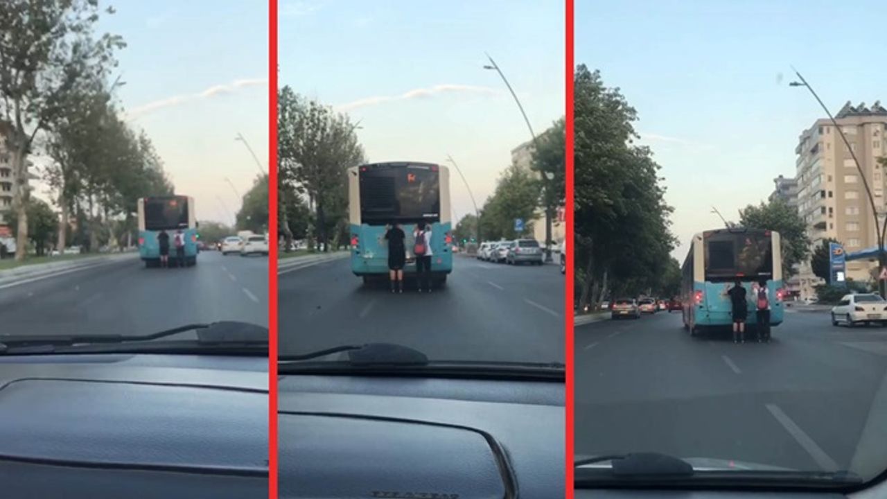 Hayatlarını hiçe sayarak otobüsünün arkasına tutunarak tehlikeli yolculuk yapan çocuklar, otobüsün hızına ve trafikteki tehlikeye aldırmadan dakikalarca yolculuk yaptı.