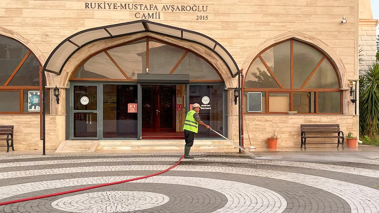 Caminin iç ve dış mekanlarında gerçekleştirilen temizlik çalışmaları kapsamında cami avluları ve abdesthaneler temizleniyor; mihrap, minber ve kürsü gibi alanlar dezenfekte ediliyor.