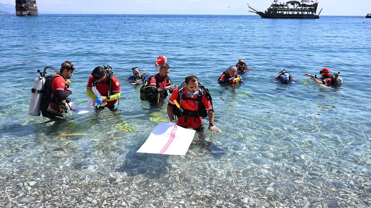 Mavi bayrak sahibi Kemer Belediyesi Halk Plajı'nda yapılan etkinlikte SKUT üyeleri, deniz dibinde temizlik yaptı. Etkinliğe katılan çevre gönüllüleri de sahilde çöp topladı.