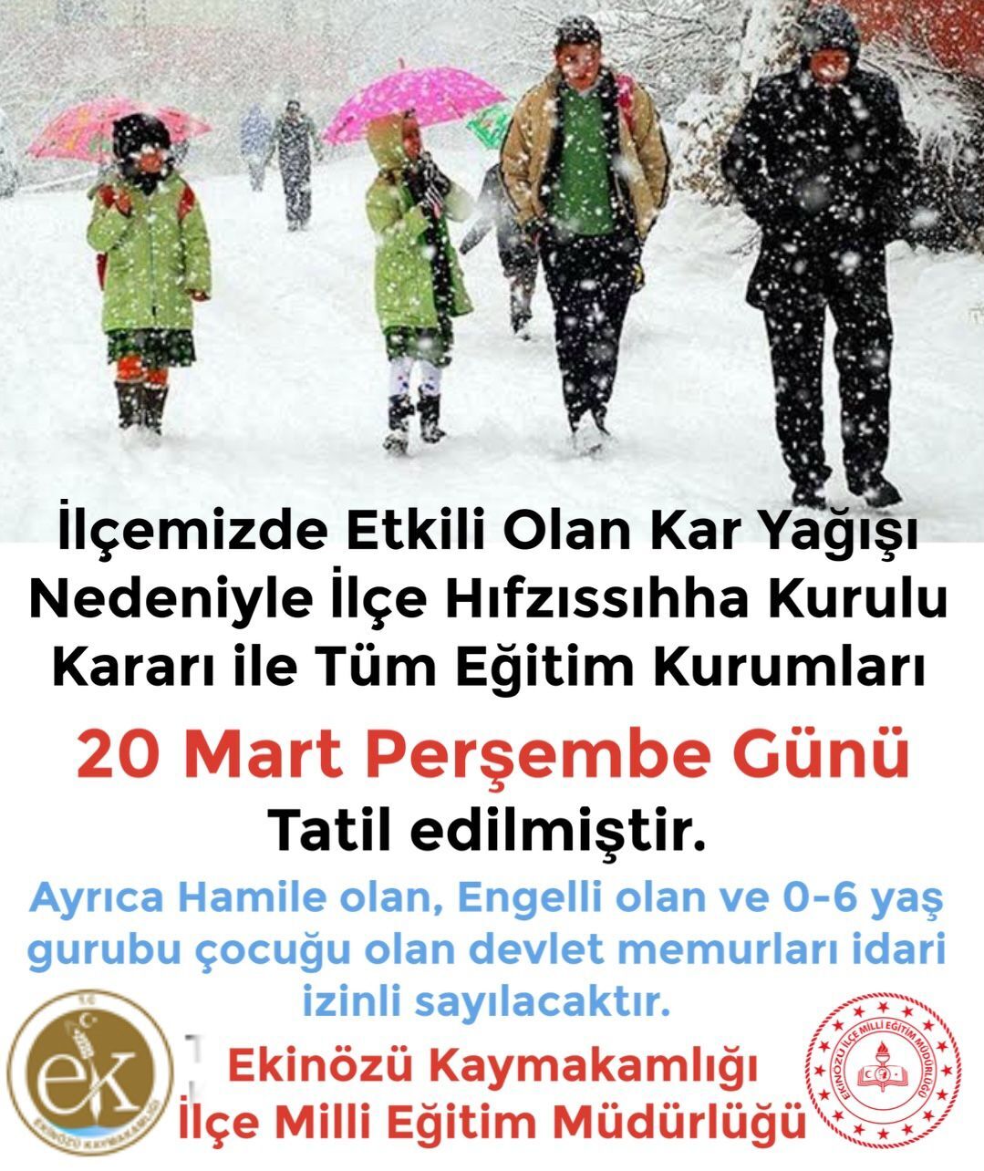 İlçe genelinde etkili olan yoğun kar yağışı, tipi ve devamında ki buzlanma göz önünde bulundurularak muhtemel olumsuzluklar ve mağduriyetlerin önüne geçebilmek adına Ekinözü İlçe Milli Eğitim Müdürlüğü ve Kaymakamlığı; İlçemiz genelinde 20 Mart Perşembe günü İlçe Hıfzıssıhha kurulu kararı ile bütün eğitim kurumları remi ve özel (okul öncesi, ilkokullar, ortaokullar, liseler ve özel eğitim kursları, rehabilitasyon merkezleri, halk eğitim merkezleri) eğitim kurumlarında eğitime bir gün süre ile ara verilmiştir. Kamu kurumlarımızda görevli hamile, engelli ve 0-6 yaş gurubu çocuğu olan Devlet Memurları ise bir günlük idari izinli sayılacaktır.”
