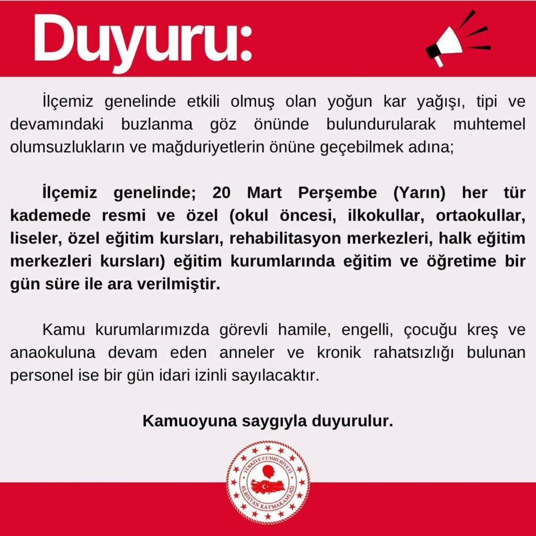İlçe genelinde etkili olan yoğun kar yağışı, tipi ve devamında ki buzlanma göz önünde bulundurularak muhtemel olumsuzluklar ve mağduriyetlerin önüne geçebilmek adına Elbistan Kaymakamlığı; İlçemiz genelinde 20 Mart Perşembe günü (yarın) her tür kademede remi ve özel (okul öncesi, ilkokullar, ortaokullar, liseler ve özel eğitim kursları, rehabilitasyon merkezleri, halk eğitim merkezleri kursları) eğitim kurumlarında eğitime bir gün süre ile ara verilmiştir. Kamu kurumlarımızda görevli hamile, engelli, çocuğu kreş ve anaokuluna devam eden anneler ve kronik rahatsızlığı bulunan personel ise bir günlük idari izinli sayılacaktır”