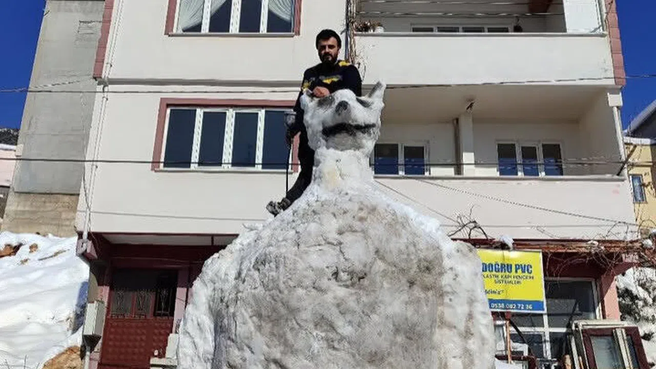 Kar birikintisinin üzerine yapılan kardan kedi, yaklaşık 4 metreyi bulan boyuyla diğer kardan adamları gölgesinde bıraktı. Kediye benzeyen figürün kulakları, yüz hatları ve gövde yapısı belirgin şekilde şekillendirildi. Vatandaşın, çalışmasını tamamladıktan sonra kardan kedinin üzerine çıkarak verdiği poz, ortaya çıkan kardan kedinin büyüklüğünü net biçimde ortaya koydu.