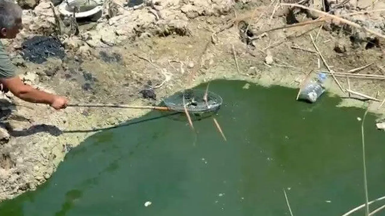 Antalya'nın Serik ilçesinde mahalle muhtarı aşırı sıcaklardan dolayı kuruyan sazlık alandaki balıkları, kendi yaptığı kafesle toplayarak telef olmaktan kurtardı...