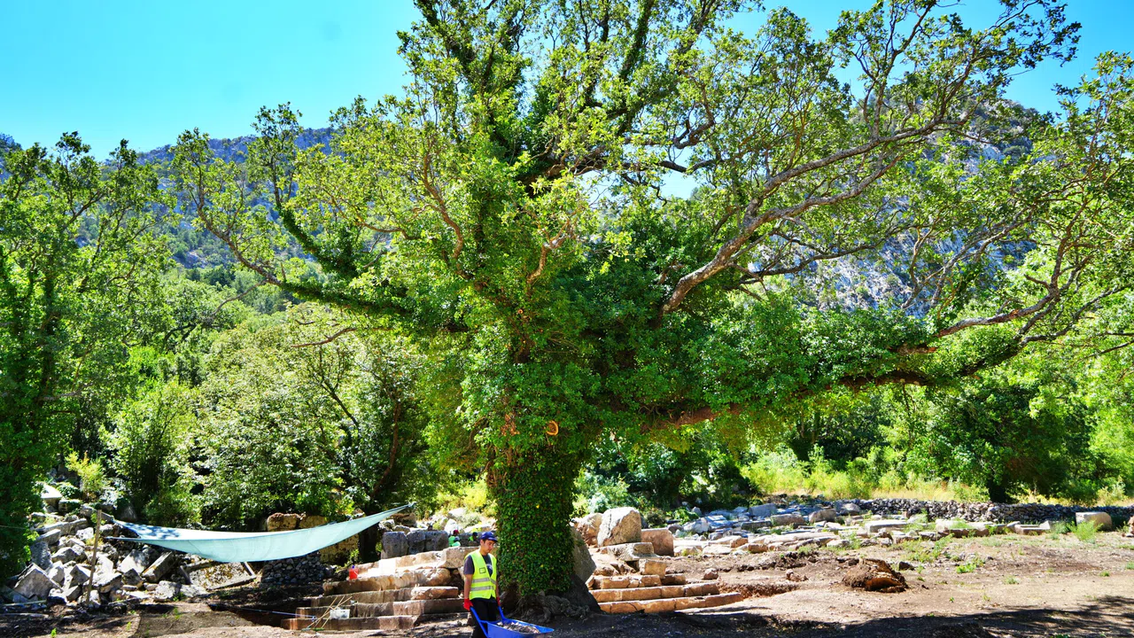 Antalya Bilim Üniversitesi ve Kültür ve Turizm Bakanlığı'nın "Geleceğe Miras Projesi" kapsamında yürütülen Termessos kazılarında doğanın antik kalıntılarla kurduğu etkileyici ilişki gözler önüne serildi. Lahit parçalarının arasında büyüyen dev bir meşe ağacı, birkaç yüz kiloluk bir taş bloğu adeta gövdesiyle kaldırmış durumda. Kazı başkanı Antalya Bilim Üniversitesi Öğretim Üyesi Doç. Dr. Mustafa Koçak, "Termessos hem bir antik kent hem de bir milli park. Burada tarih ve doğa kelimenin tam anlamıyla iç içe geçmiş durumda. Bunun en güzel örneklerinden birini bu ağaçta görüyoruz" dedi.
