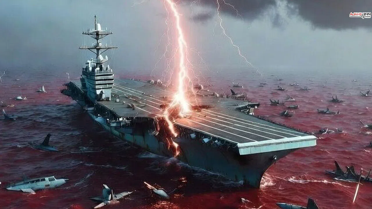 Paylaşılan görselde, fırtınalı bir deniz ve koyu kırmızı tonların hâkim olduğu dramatik bir atmosfer dikkat çekti. Kompozisyonda, ABD donanmasına ait uçak gemisinin hedef konumunda gösterildiği, gemiye yıldırım isabet ettiği detayının işlendiği görüldü. Bunun yanı sıra ABD’ye ait savaş uçaklarının denize düşmüş ve batmış şekilde tasvir edilmesi ile denize saplanmış kılıç figürleri görselin öne çıkan unsurları arasında yer aldı.