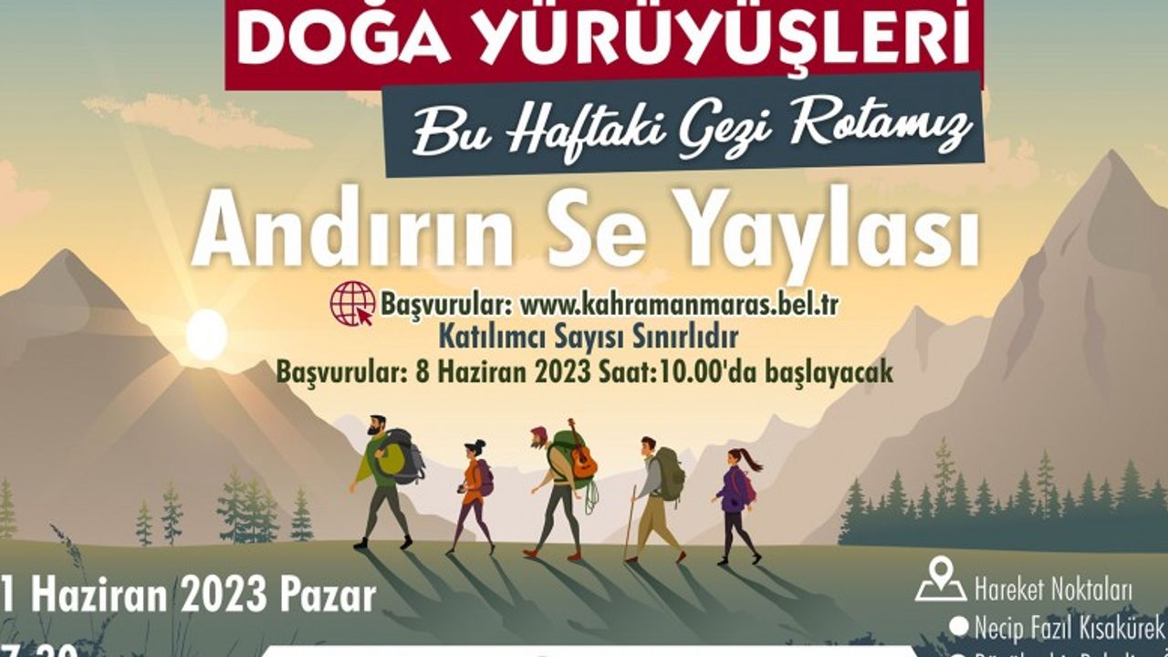 Büyükşehir’in Doğa Yürüyüşleri’nin bu haftaki rotası Andırın Se Yaylası olacak. 11 Haziran Pazar günü gerçekleştirilecek yürüyüşe başvurular, 8 Haziran Perşembe günü saat 10.00 itibariyle Büyükşehir’in internet adresinden yapılabilecek.