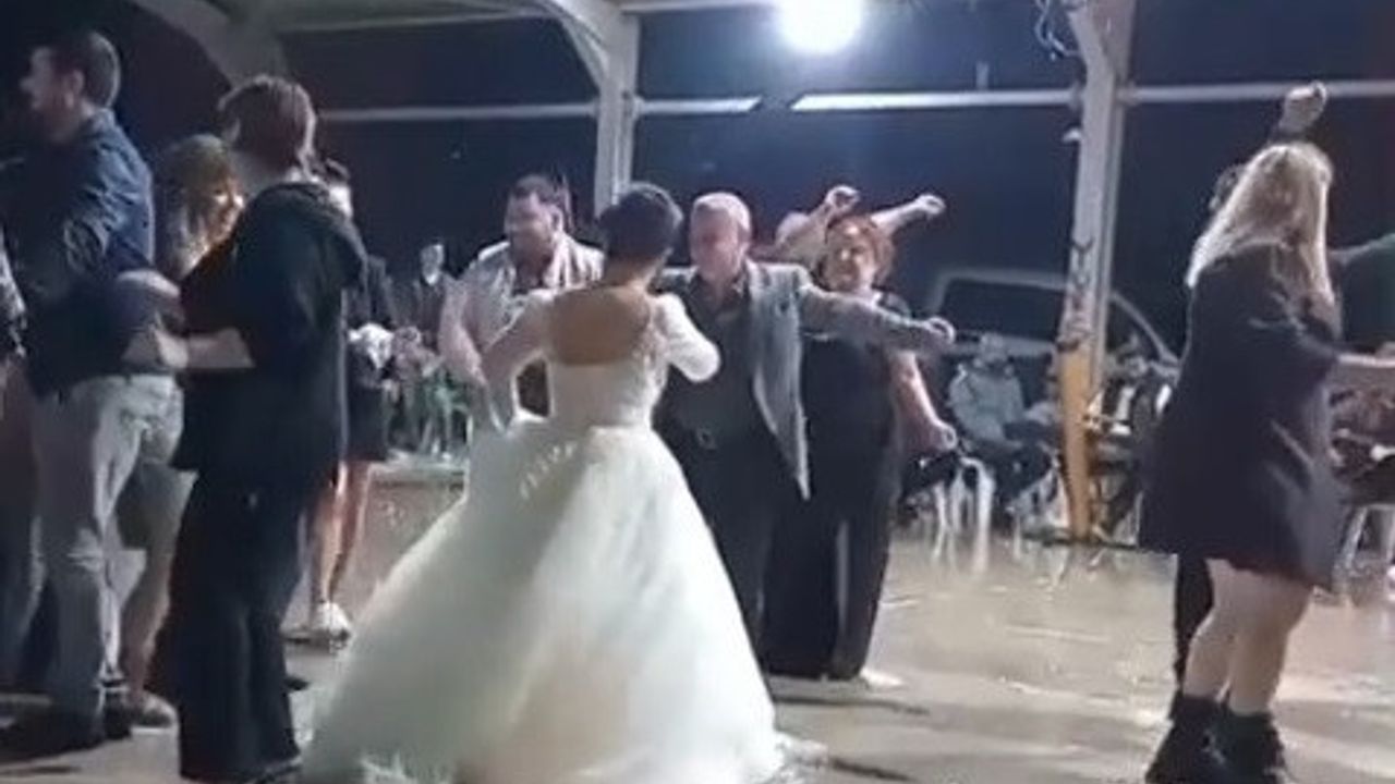 Cep telefonu ile kaydedilen görüntülerde, gelin ve damadın su dolu pistte paçaları sıvamış davetlilerle birlikte eğlenceye devam ettiği görüntüler yer aldı. Bazı misafirler ise sandalyelerin üzerine çıkarak sulardan korunmaya çalıştı. Organizasyon ekibi tarafından düğün alanında suların çekilmesiyle, yağışa rağmen müzik kesilmedi ve eğlence devam etti.