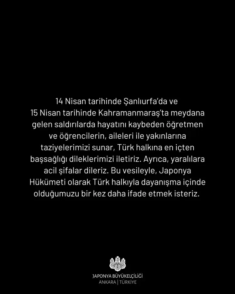 Japonya Büyükelçiliği, 14 Nisan'da Şanlıurfa ve 15 Nisan'da Kahramanmaraş'ta meydana gelen saldırılarda yaşamını yitiren öğretmen ve öğrenciler için taziye mesajı yayımladı.