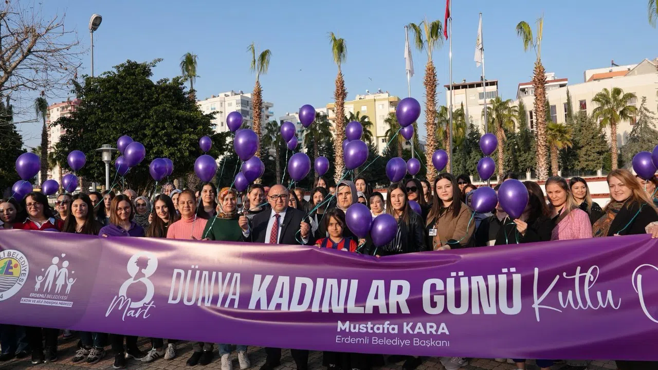 Erdemli Belediye Başkanı Mustafa Kara açıklamasında " Bugün kadın mesai arkadaşlarımız ile birlikte eşitlik ve adaleti simgeleyen mor balonları gökyüzüne bıraktık. Tüm kadınlarımızın 8 Mart Dünya Kadınlar Günü kutlu olsun" dedi.
