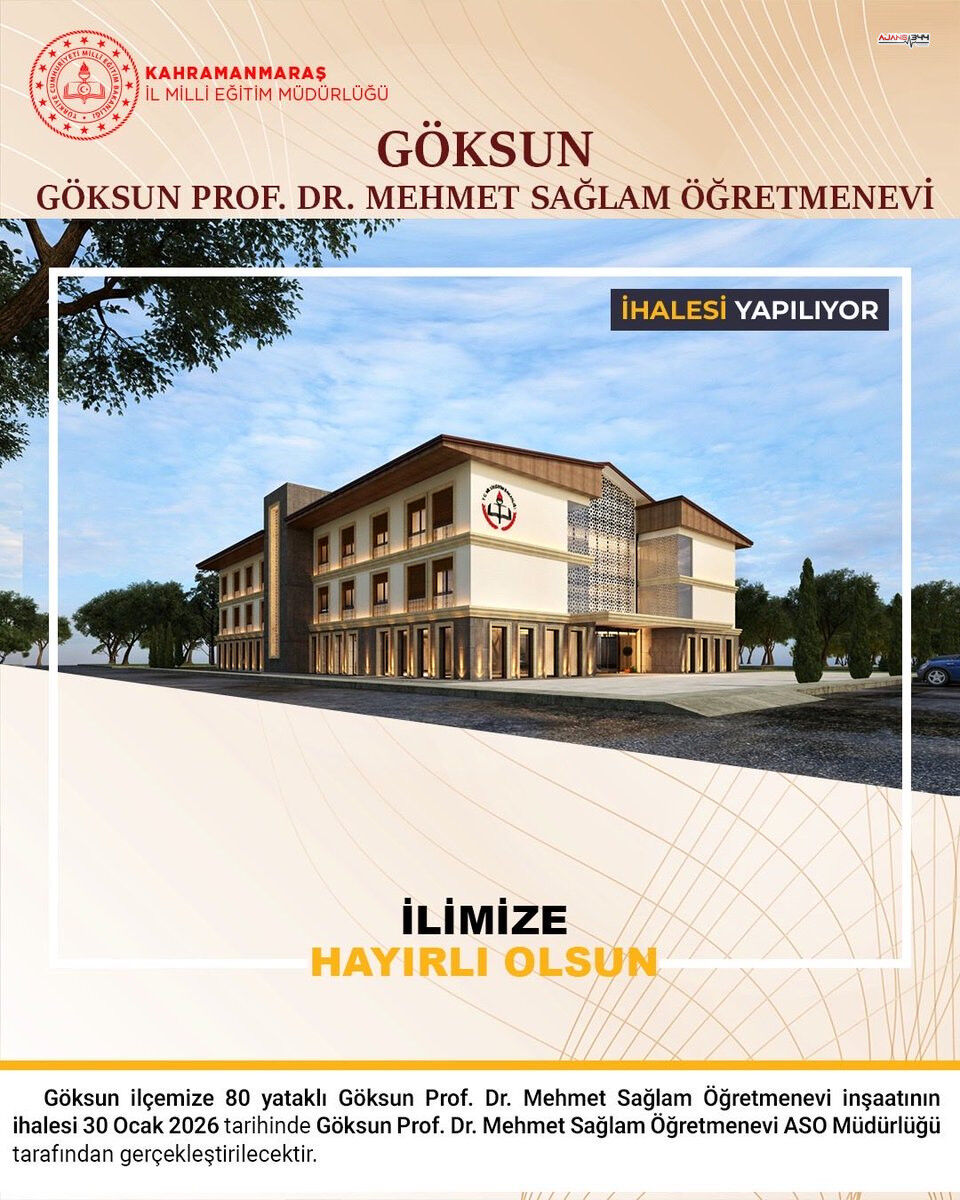 Kahramanmaraş İl Milli Eğitim Müdürlüğü, Göksun'a yapılacak 80 yataklı Prof. Dr. Mehmet Sağlam Öğretmenevi inşaatı için ihale tarihini duyurdu. İhalenin, 30 Ocak 2026 tarihinde Göksun Prof. Dr. Mehmet Sağlam Öğretmenevi ASO Müdürlüğü'nde gerçekleştirileceği açıklandı. Bu duyuru, projenin hayata geçirilmesi yolundaki resmi sürecin başlangıcı oldu.