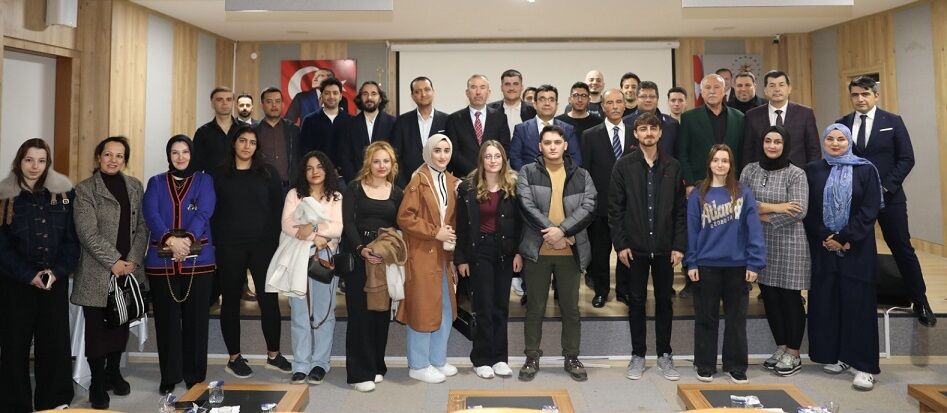 KİÜ İnsan ve Toplum Bilimleri Fakültesi Konferans Salonu'nda gençlerle buluşan Balcıoğlu'na program sonunda KİÜ Genel Sekreteri Ferat Karataşlı tarafından plaket takdim edildi.