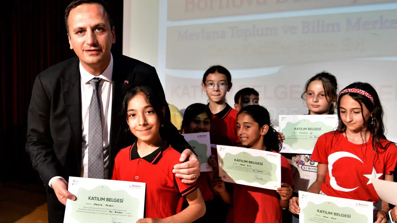 Bornova Belediyesi Mevlana Toplum ve Bilim Merkezi / Genç Kaşifler Bilim Evi’nde 2025 Bahar Dönemi Katılım Belgesi Töreni renkli görüntülere sahne oldu. Bornova Belediye Başkanı Ömer Eşki’nin katılımıyla gerçekleşen törende, Bilim Kulüpleri ve Python Programlama Atölyesi’ne katılan öğrencilere katılım belgeleri, projeye destek veren Ege Üniversitesi öğrencilerine ise teşekkür belgeleri verildi. Program boyunca çocukların heyecanına aileleri de ortak oldu.