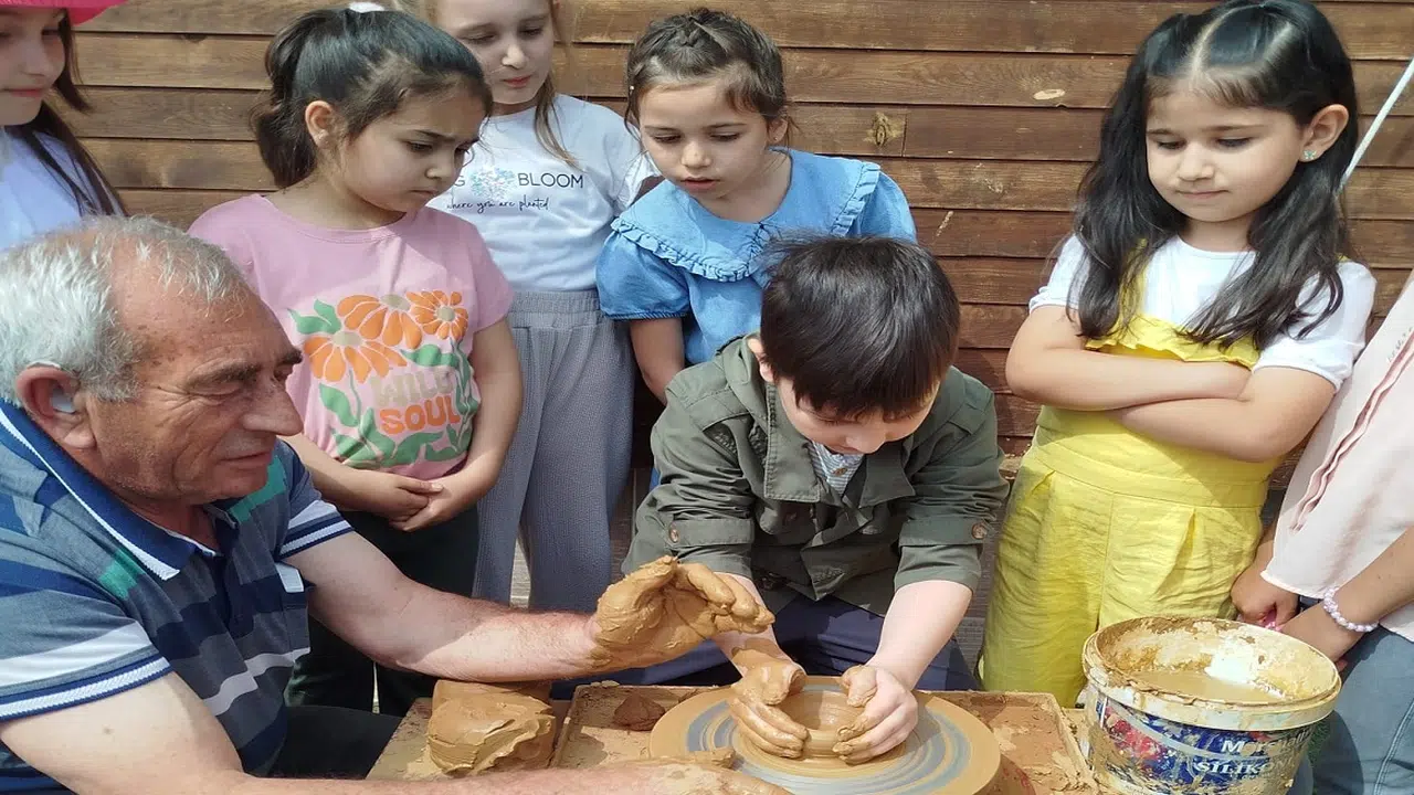 Minik öğrenciler, kendi elleriyle çamura şekil vererek ilk çömleklerini yapmanın heyecanını yaşadı.