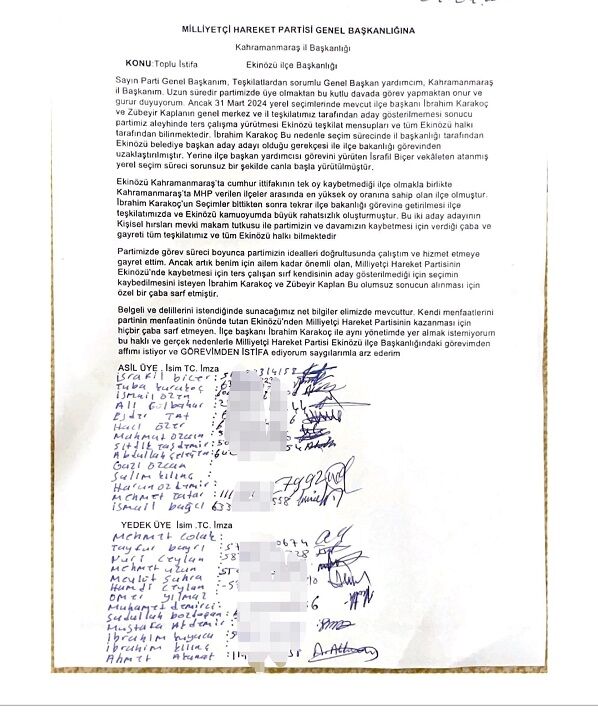 Belgeli ve delillerini istendiğinde sunacağımız net bilgiler elimizde mevcuttur. Kendi menfaatlerini partinin menfaatinin önünde tutan Ekinözü’nden Milliyetçi Hareket Partisinin kazanması için hiçbir çaba sarf etmeyen. İlçe başkanı İbrahim Karakoç ile aynı yönetimde yer almak istemiyorum bu haklı ve gerçek nedenlerle Milliyetçi Hareket Partisi Ekinözü ilçe Başkanlığındaki görevimden affımı istiyor ve GÖREVİMDEN İSTİFA ediyorum saygılarımla arz ederim.”