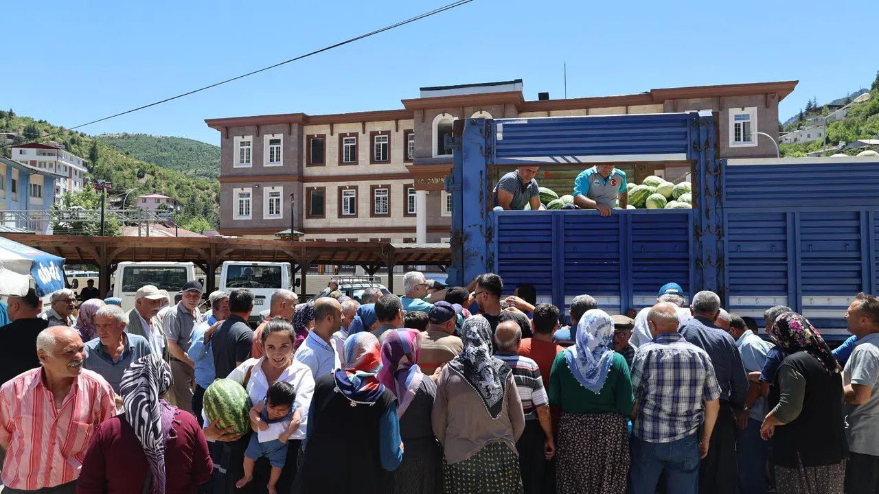 Belediye ekipleri tarafından ilçenin farklı noktalarında dağıtılan karpuzlara vatandaşlar yoğun ilgi gösterdi.