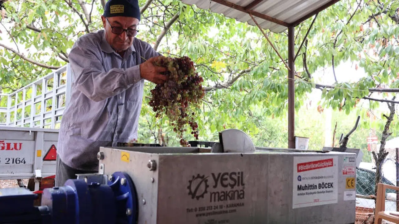 Antalya Büyükşehir Belediyesi'nin üzüm sıkma makineleri gelen talepler doğrultusunda mahalle mahalle dolaşarak pekmez üretimi yapan üreticilere destek sağlıyor.