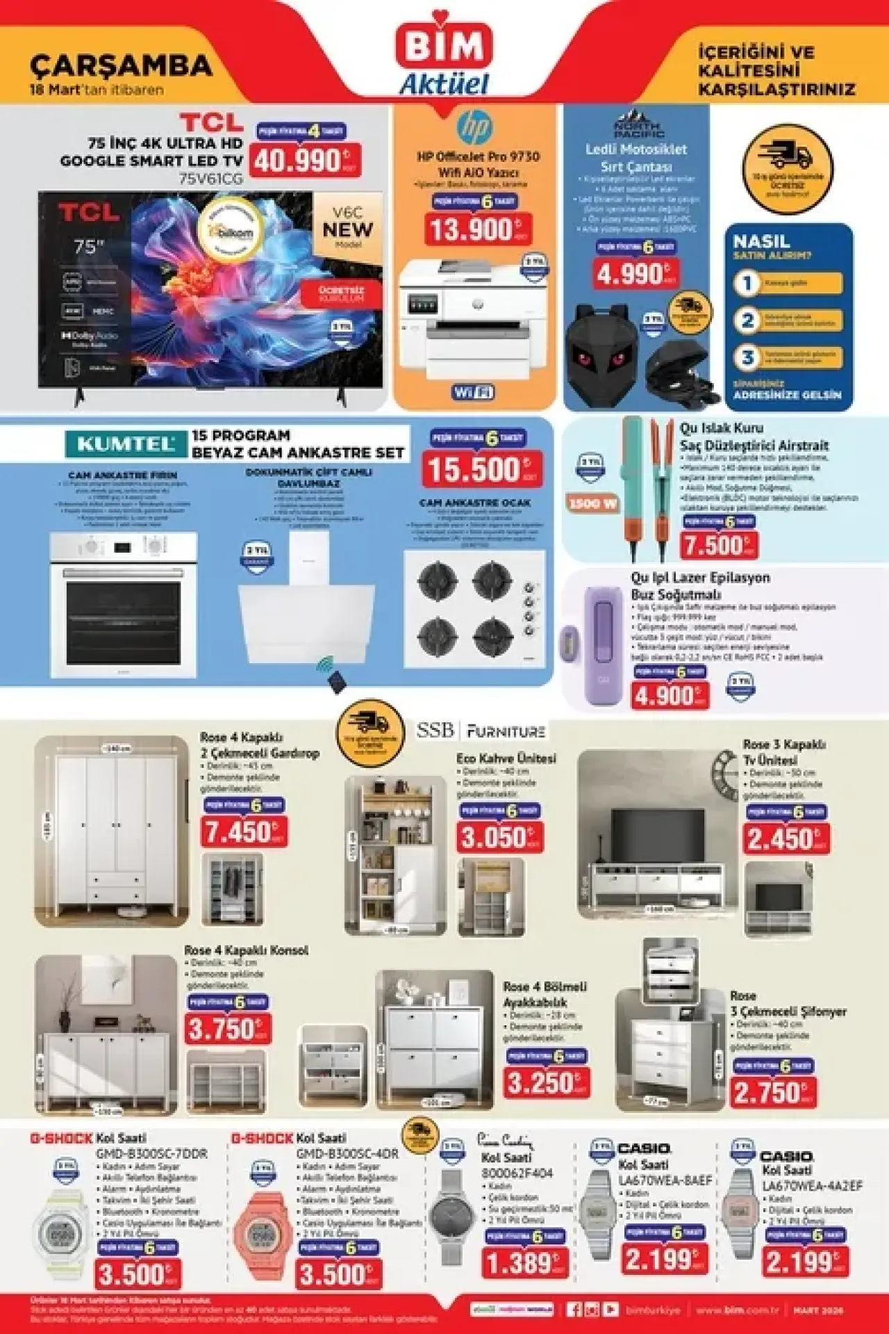 17 ve 18 Mart tarihlerinde satışa sunulacak ürünler arasında ev gereçleri ve bazı elektronik ürünlerin de yer aldığı ifade edildi. Mutfak kullanımına yönelik pratik ürünlerin yanı sıra ev düzenini kolaylaştıracak çeşitli araç gereçler de katalogda dikkat çeken başlıklar arasında yer aldı.