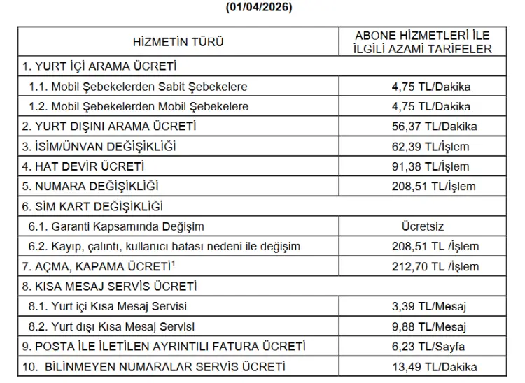 Bilgi Teknolojileri ve İletişim Kurumu (BTK)'nun 17 Mart 2026 tarihli toplantısında alınan karar 1 Nisan 2026 tarihi itibariyle yürürlüğe girdi. Kurul kararıyla operatörlerin uygulayabileceği azami konuşma, SMS ve çeşitli hizmet ücretlerinde artışa gidildi.
