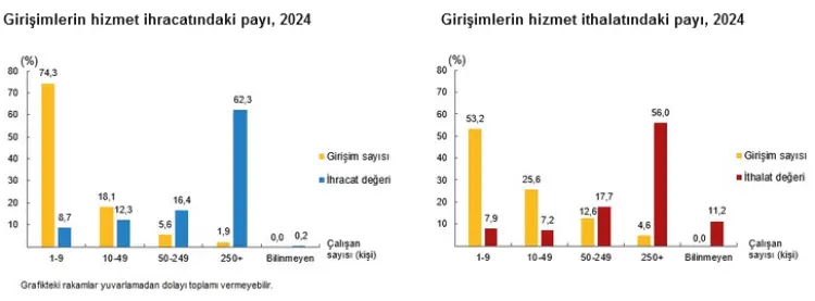 Verilere göre, hizmet ihracatının yüzde 62,3'ü ve hizmet ithalatının yüzde 56'sı 250 ve üzeri çalışanı bulunan büyük ölçekli girişimler tarafından gerçekleştirildi.