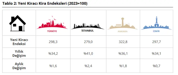 Üç büyük şehirde kira artışları da hız kesmedi. İstanbul'da kiralar aylık yüzde 2,4, Ankara'da yüzde 1,8 ve İzmir'de yüzde 0,7 arttı. Yıllık artış ise İstanbul'da yüzde 41,0 ile en yüksek seviyeye ulaşırken, Ankara'da yüzde 36,1 ve İzmir'de yüzde 34,1 olarak gerçekleşti.