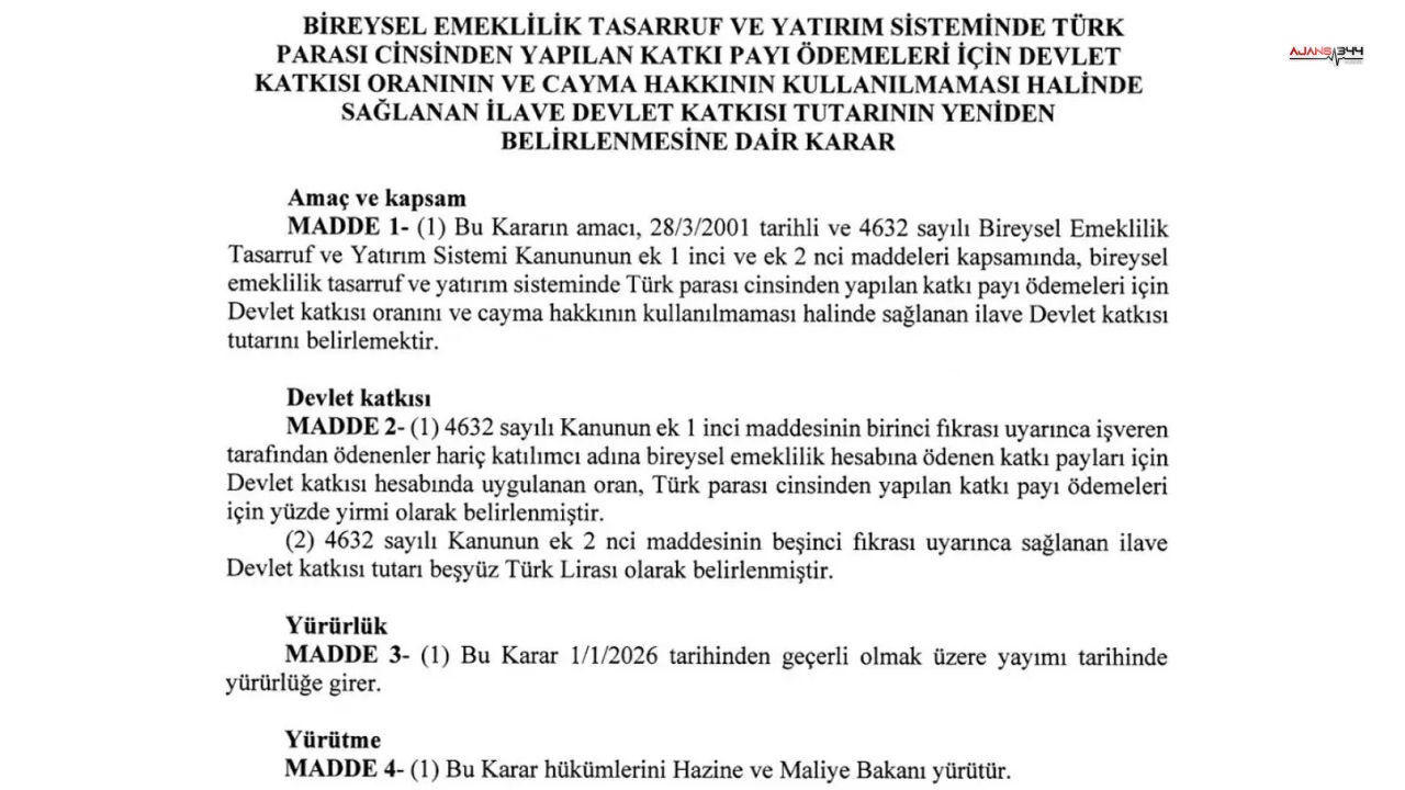 Bireysel Emeklilik Sistemi'nde (BES) önemli bir değişiklik resmiyet kazandı. Daha önce %30 olarak uygulanan devlet katkısı oranı, %20'ye düşürüldü. 7 Ocak 2026 tarihli Resmi Gazete'de yayımlanan Cumhurbaşkanı Kararı, yayımı ile birlikte yürürlüğe girdi.