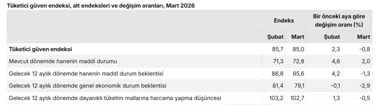 TÜİK'in açıkladığı tüketici güven endeksi Mart ayında yüzde 0,8 azalışla 85,0 oldu. Şubat ayında bu endeks 85,7 seviyesindeydi.