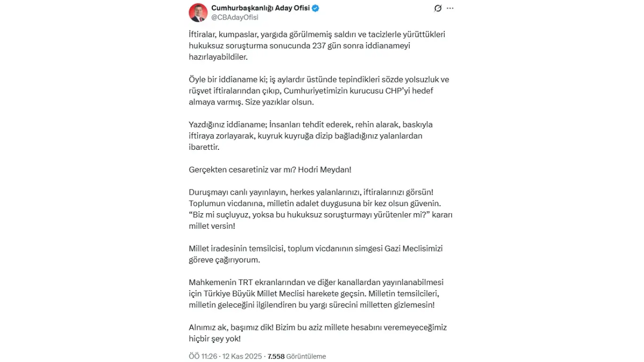 Açıklamasında "Gerçekten cesaretiniz var mı? Hodri Meydan! Duruşmayı canlı yayınlayın, herkes yalanlarınızı, iftiralarınızı görsün!" diyen İmamoğlu, toplumun vicdanına ve milletin adalet duygusuna güvenilmesi gerektiğini vurguladı. "Biz mi suçluyuz, yoksa bu hukuksuz soruşturmayı yürütenler mi?" sorusunun cevabını milletin vermesini istedi.