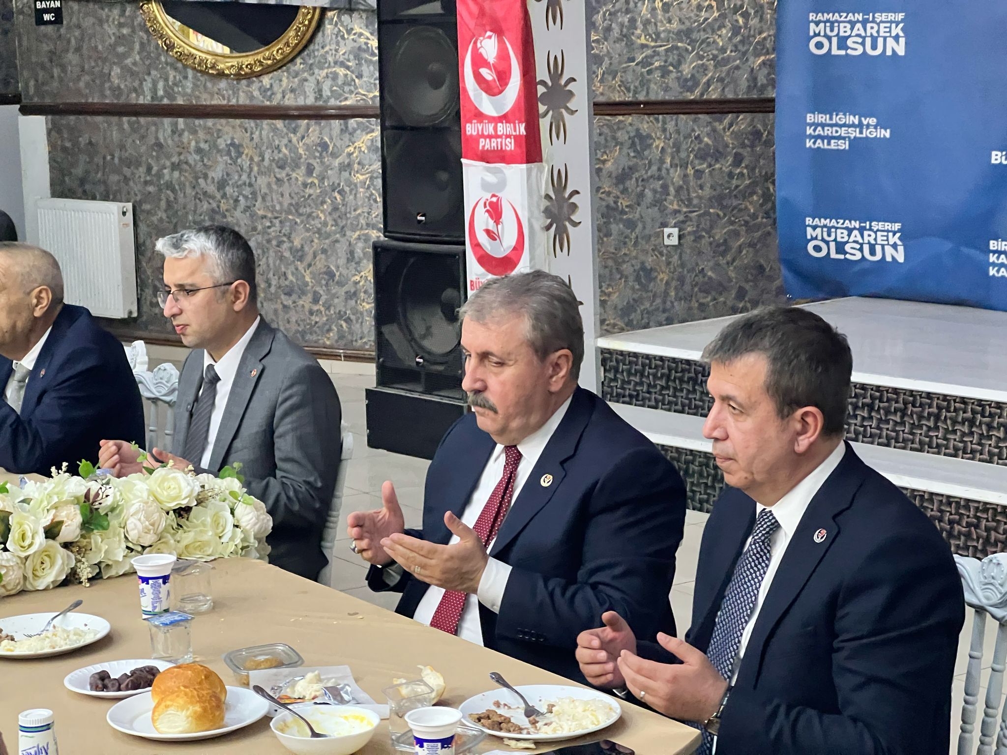 İftarın ardından açıklamalarda bulunan Destici; “Doğu Türkistan’da, Filistin’de, Gazze’de, Sudan’da, Myanmar’da ve pek çok noktada zalimlerin zulmü devam ediyor. O kardeşlerimiz de o soydaşlarımızda o dindaşlarımız da tıpkı bizim gibi kendi vatanlarında özgürce ramazanlarını yaşasınlar, namazlarını kılsınlar, oruçlarını tutsunlar ve özgürce ben Türküm, ben Müslümanım diye haykırsınlar inşallah. Türk ismi yazdırılmıyor Türkçe tabela yazdırılmıyor Türk okulları birer birer kapatılıyor. Onun için ülkemizin ve Devletimizin kıymetini bileceğiz ve bu güçlü Devlet yapımızla da soydaşlarımızın ve dindaşlarımızı soydaşlarımızın ve dindaşlarımızın bulunduğu yerlere taşıyacağız onları da özgürleştireceğiz ve onları da zalimlerin zulmünden Allah’ın izniyle kurtaracağız. DEM Partisi Pkk nın eş başkanlarında birisinin bir vilayette yaptığı Nevruz konuşmasında “bu güne kadar verdiğimiz mücadelemizde başarılı olduk bu yılda bu taleplerimizin tamamını alacağız” diyor. Biz pazarlıksız şartsız pkk nın silah bırakmasından neden rahatsız olalım! Silahı bırakana al silahı dağa mı çık diyeceğiz onun için hainlerle pazarlık olmaz” İfadelerini kullandı.