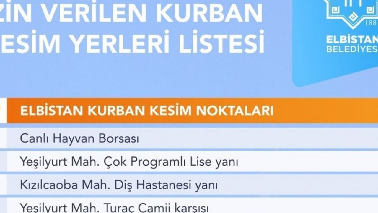 Elbistan Kurban Hizmetleri Komisyonu, vatandaşların kurban ibadetini rahat ve hijyenik bir ortamda gerçekleştirebilmeleri için kesim noktalarını belirledi. Buna göre, Elbistan’da 10 farklı noktada kurban kesimi yapılabilecek. İlçe genelindeki kurban kesim alanları şu şekilde olacak; Hayvan borsası, Yeşilyurt Çok Programlı Lise yanı, Kızılcaoba Mahallesi eski diş hastanesi yanı, Yeşilyurt Mahallesi Hacı Turaç Cami karşısı, Pınarbaşı Mahallesi Elbistan Ortaokulu bahçesi, Pınarbaşı Mahallesi açık pazar yeri, Hocazade Camii önü pazar yeri, Tepebaşı Caddesi okul bahçesi, Cumhuriyet Mahallesi Hacı Esat Efendi Caddesi eski pazar yeri karşısı ve Yeşilyurt Mahallesi TOKİ İlkokulu bahçesi.”